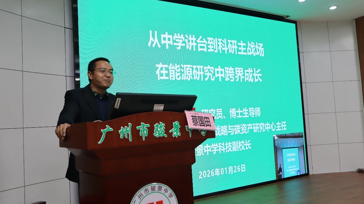 1月26日下午,广州能源所能源战略与碳资产研究中心主任蔡国田研究员受邀在广州市骏景中学作科普讲座《从中学讲台到科研主战场 在能源研究中跨界成长》。150余名学生现场听取讲座,全校师生通过直播收看。