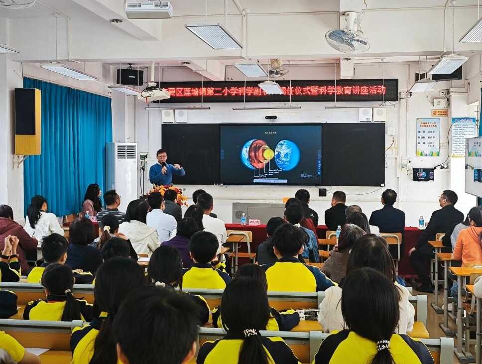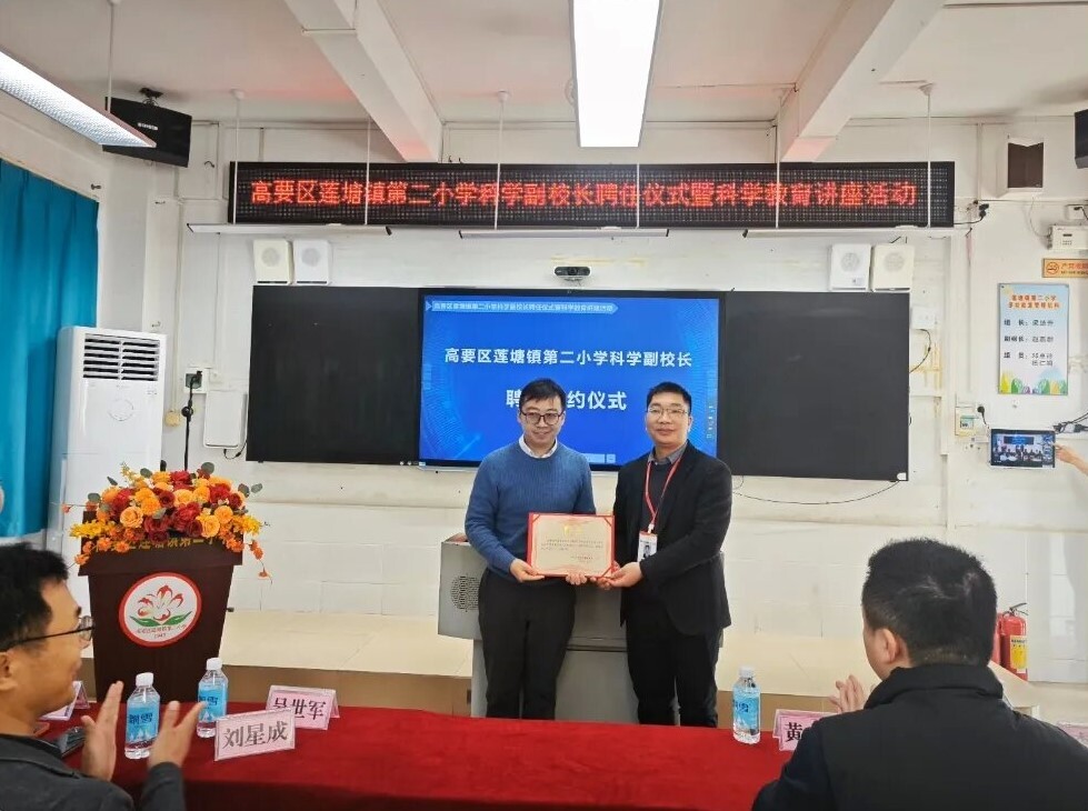 在热烈的氛围中,莲塘镇第二小学隆重聘任中国科学院广州地球化学研究所刘星成研究员为科学副校长。一纸聘书,不仅是一份荣誉,更是一份责任,标志着高??蒲凶试从牖〗逃导迪稚疃榷越樱?蒲Ы逃⑷胂驶畹淖ㄒ盗α?。刘星成研究员表示很荣幸受聘为科学副校长,将充分发挥自身科研与科普经验,助力学生科学素养提升,推动学??蒲Ы逃咧柿糠⒄?。