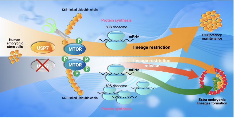 近期,中国科学院广州生物医药与健康研究院发表了题为“USP7 restricts lineage potency in human embryonic stem cells through modulating mTOR activity”的研究论文。该研究揭示了一种限制人多能干细胞发育潜能的关键因子——去泛素化酶USP7,并阐释其通过去除mTOR 蛋白上非经典K63多泛素化修饰,从而调控 mTOR 活性的全新机制。
