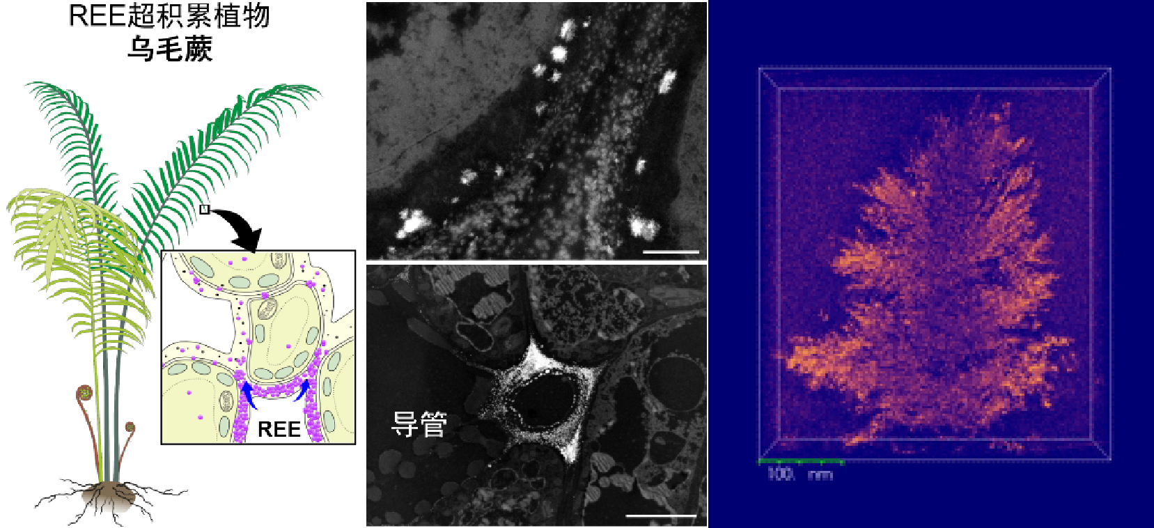 ?尽管人们已知微生物和动物能在生物体内“造矿”,例如趋磁细菌合成的纳米磁铁矿,贝壳及珊瑚沉积形成的方解石和文石,动物牙齿和骨骼中矿化的磷灰石等。但植物界的“矿物制造能力”在此前一直被低估。已知的植物矿物仅有少数几种,如方解石和草酸钙石等钙质晶体以及植硅体。本研究首次在乌毛蕨中发现稀土纳米矿物结晶矿化现象,不仅刷新了我们对植物矿物形成的认知,还为植物对重金属积累过程中的富集和解毒机制研究提供了新的方向,也为近千种已知超富集植物的研究开辟了新方向。