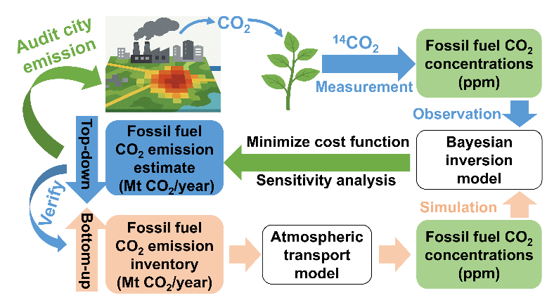 ????近日,中国科学院广州地球化学研究所研究员张干团队在利用植物放射性碳(14C)约束与贝叶斯反演进行城市尺度化石源二氧化碳排放(CO2ff)核查方面取得新进展。团队将基于植物?14C估算的?CO2ff?与大气传输—反演框架深度耦合,构建出一套低成本、可扩展且面向治理的碳排放独立核查方法。相关成果于10月22日发表于国际期刊?《Environmental Science & Technology》。?