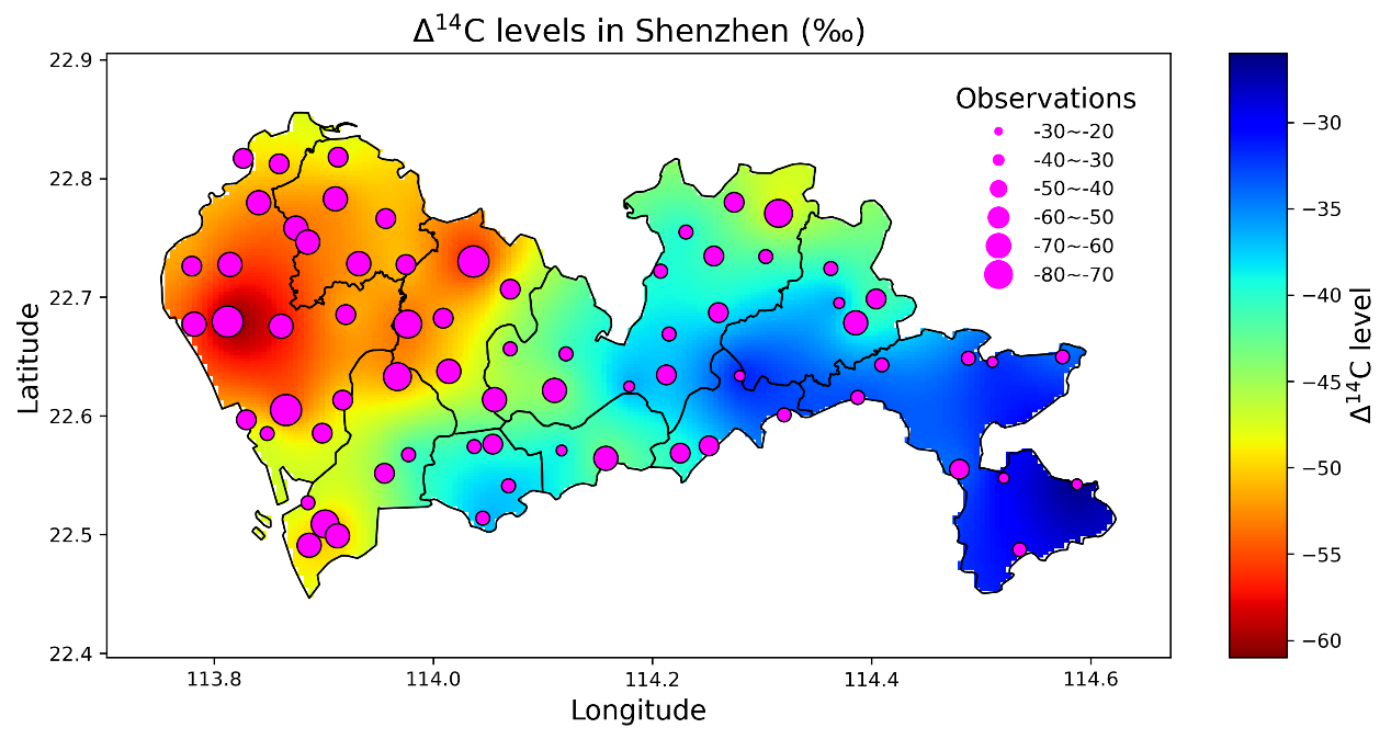 ????据此,中国科学院广州地球化学研究所张干研究员和李静博士后与深圳市生态环境监测中心站副研究员王伟民等科研人员合作,建立了植物?14C 与贝叶斯反演深度耦合的技术方法(图1),并将其应用于深圳市化石源CO2排放清单的校验,取得了良好的实践效果。研究团队在深圳构建了?5×5 km2?网格,对70个采样站点的草本植物进行14C分析(图2),获得了对生长季大气?14CO2?的高密度、时间整合约束,为贝叶斯反演提供了充足数据和高分辨率网格空间覆盖。