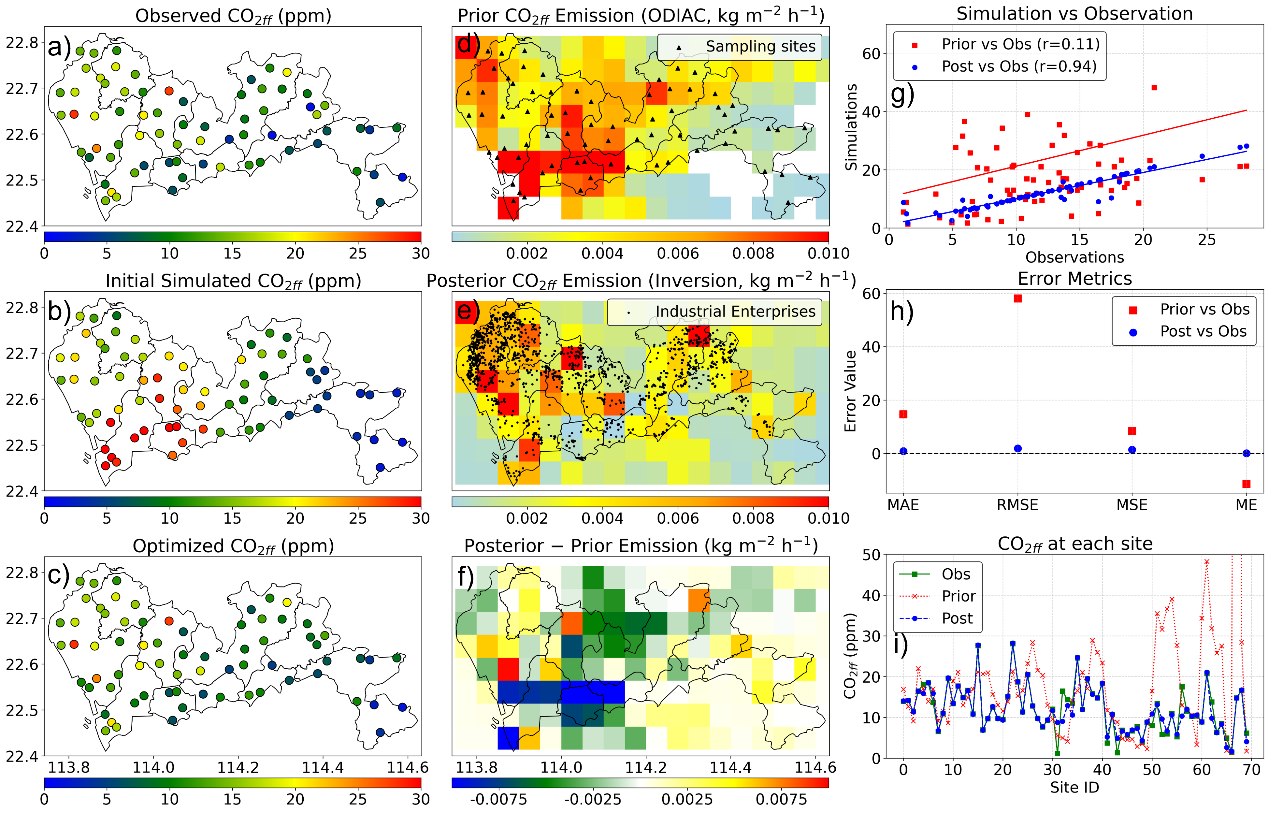 图3:使用 ODIAC 作为先验的反演结果。左列展示基于观测得到的 CO2ff?空间分布 (a)、初始模拟 (b,使用先验排放) 与优化后模拟 (c,使用后验排放);中列给出先验排放 (d)、后验排放 (e) 及二者差值 (f);右列包含模拟值与观测值的散点对比图 (g)、误差指标 (h,MAE、RMSE、MSE、ME),以及各采样点的 CO2ff?浓度 (i) (MAE:平均绝对误差,RMSE:均方根误差,MSE:均方误差,ME:平均误差)。