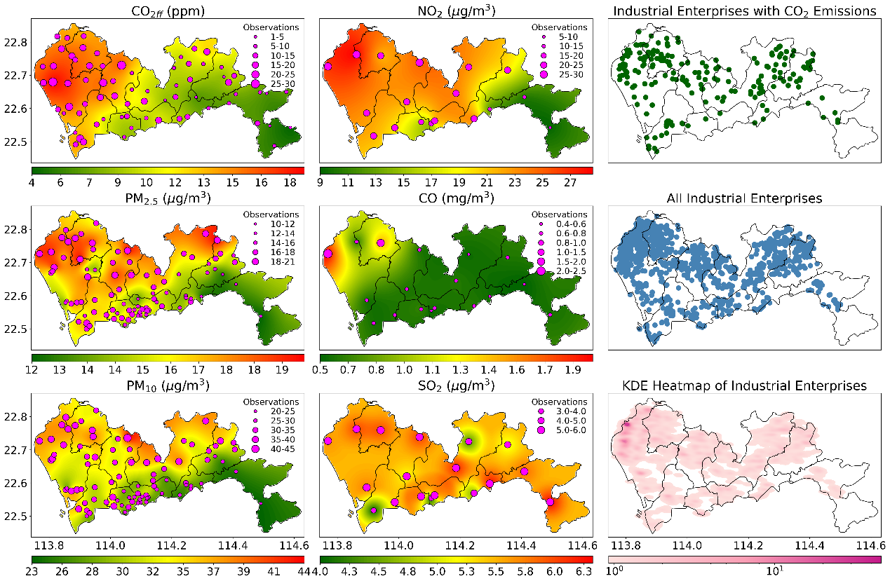 图4:2022 年深圳市基于 Δ14C 推导的 CO2ff?排放、空气污染物与工业企业的空间分布。左侧两列依次为: (a) CO2ff?浓度(ppm),(b) 细颗粒物 PM2.5(μg m?3),(c) 可吸入颗粒物 PM10(μg m?3),(d) 二氧化氮 NO2(μg m?3),(e) 一氧化碳 CO(mg m?3),(f) 二氧化硫 SO?(μg m?3)。各图的颜色梯度表示对应污染物的浓度水平,洋红色圆点为观测值。右列各图为: (g) 具有 CO2?排放的工业企业分布,(h) 全部工业企业分布,(i) 工业企业核密度估计(KDE)热力图,突出工业密度较高与潜在排放源区域。