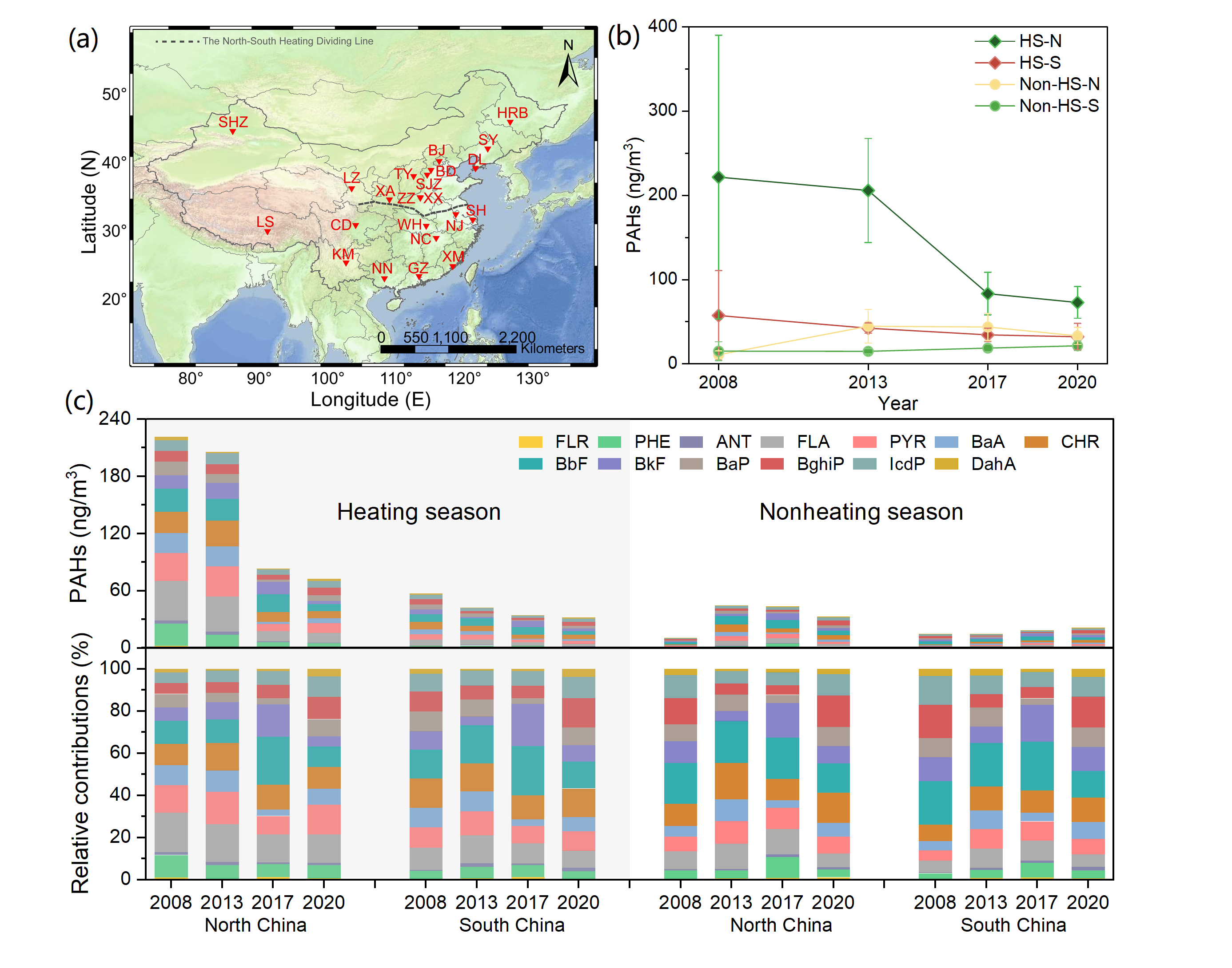 图1. 中国典型城市在2008、2013、2017、2020年开展的四次外场观测采样点分布图;(b)2008、2013、2017和2020年北方地区采暖季(HS-N)、南方地区采暖季(HS-S)、北方非采暖季(Non-HS-N)和南方非采暖季(Non-HS-S)PAHs浓度的变化趋势。(c)2008、2013、2017和2020年13种PAHs的浓度和相对贡献的分布特征。