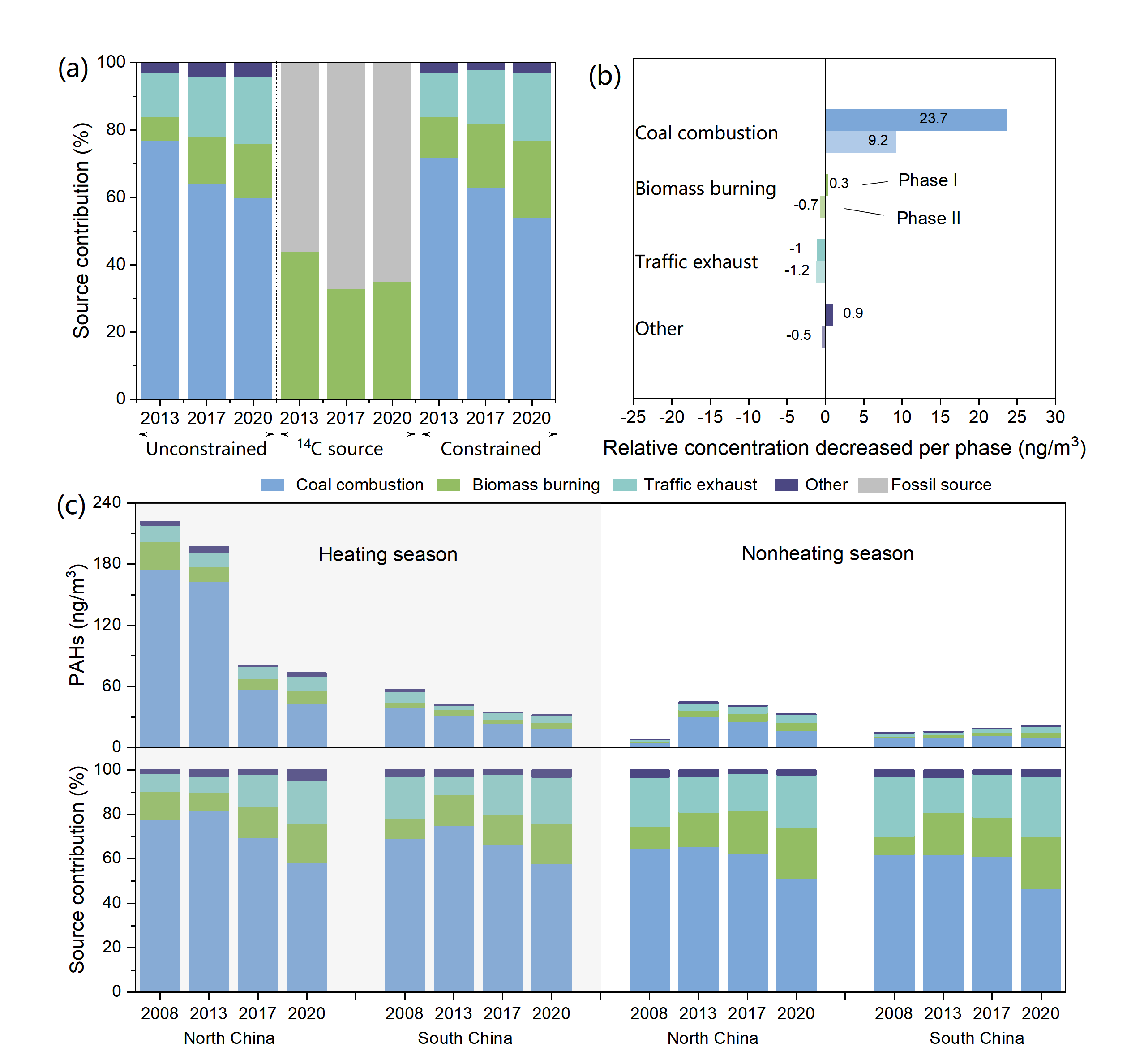图2. (a)2013、2017和2020年PMF模型初始结果与引入14C-BC约束结果中PAHs四种来源之间的贡献比较。(b)两次清洁空气政策阶段,燃煤、生物质燃烧、交通排放及其他来源PAHs浓度的下降趋势。(c)2008、2013、2017和2020年中国南方和北方的采暖季(HS)和非采暖季(Non-HS)不同来源PAHs浓度的季节性和区域性变化。