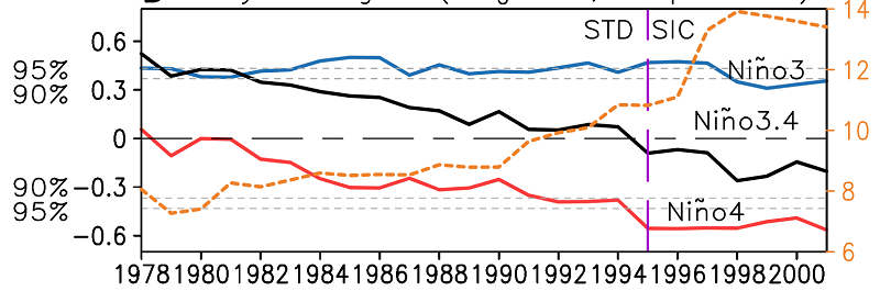 图1 白令海冬季海冰密集度(SIC)年际变率及其与ENSO的21年滑动相关关系(1979–2022)。橙色虚线:1–3月(JFM?)白令海SIC的21年滑动标准差(表征变率强度);黑色实线:前一年夏季(JJA?)Ni?o3.4指数与JFM?白令海SIC的滑动相关系数;蓝色(红色)实线:剔除Ni?o4(Ni?o3)影响后,JJA? Ni?o3(Ni?o4)指数与JFM?白令海SIC的偏相关系数。