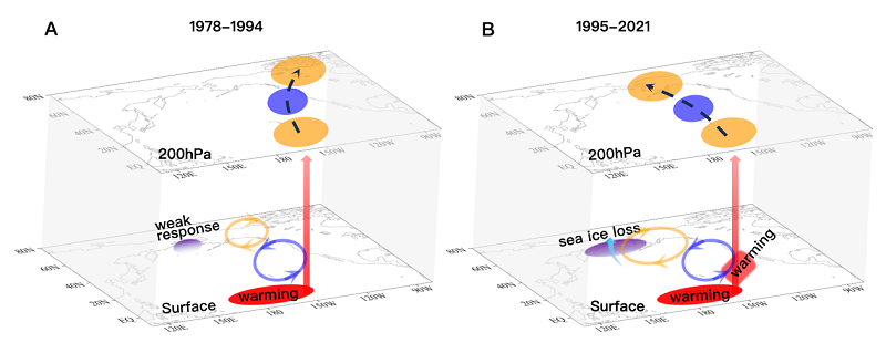 图2 NPMM调制下中太平洋型ENSO对白令海冬季海冰影响的机制转变示意图。(A)1978-1994年:赤道中太平洋暖海温异常激发类PNA型的大气遥相关波列,在对流层高层于北美北部形成显著高压异常,而低层反气旋较弱。此环流结构不利于暖空气向北输送和海冰南向输运,白令海海冰变化不显著。(B)1995-2021年:中太平洋型厄尔尼诺与正位相NPMM耦合,增强并西移了向极传播的罗斯贝波列。北美西北部及至白令海上空高压异常增强。白令海东部低层反气旋引发持续南风异常,一方面阻碍海冰南输,一方面促进暖湿空气北进,共同造成白令海海冰显著减少。