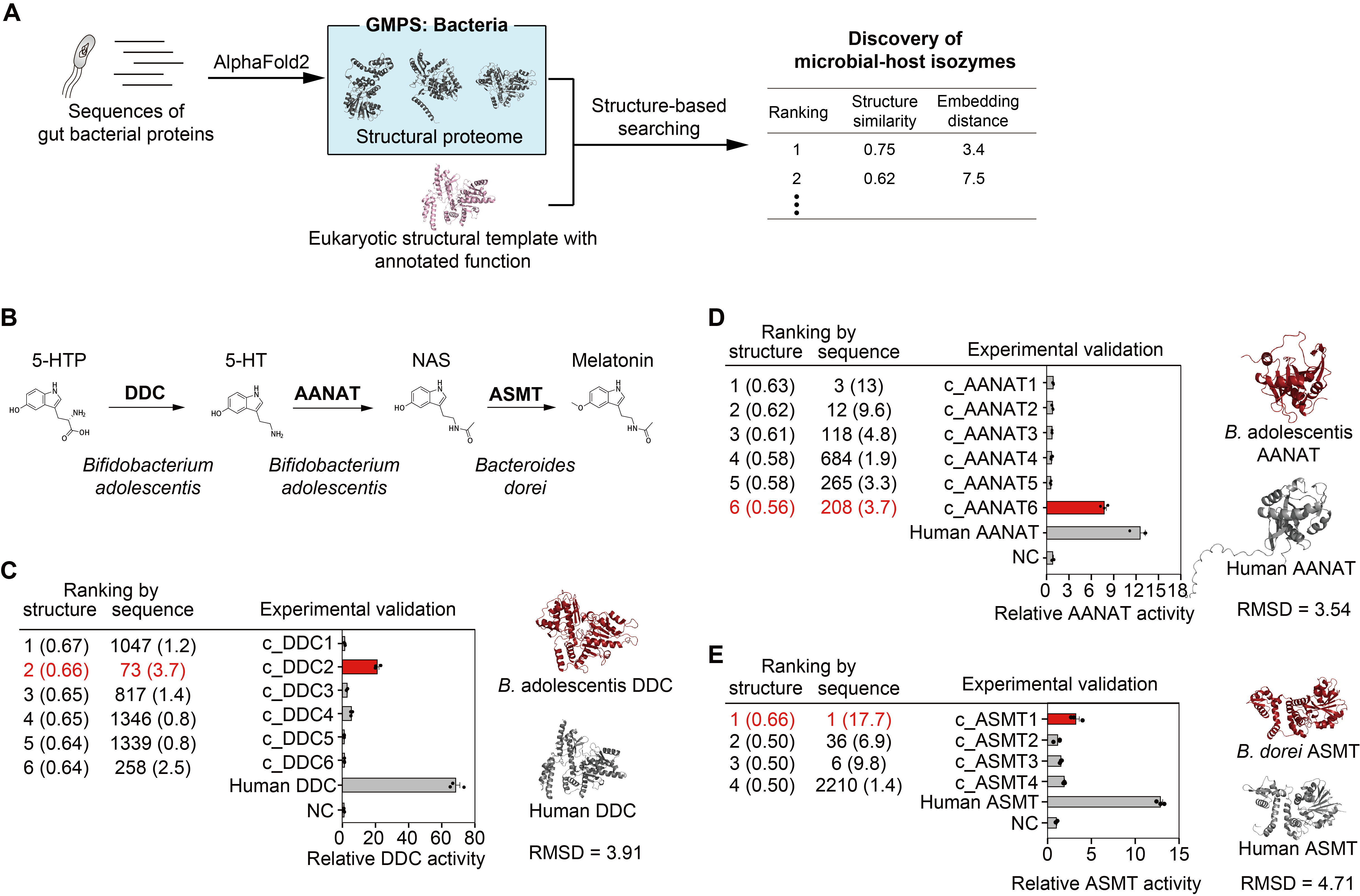 研究团队进一步将结构检索的方法拓展至肠道菌源的宿主同工酶。前期研究发现,肠道细菌编码的酶能模拟宿主酶的功能,参与疾病的发生发展过程。通过结构检索,研究团队在青春双歧杆菌(Bifidobacterium adolescentis)、多形拟杆菌(Bacteroides dorei)中发现了参与褪黑素合成的关键酶,首次揭示了肠道微生物的褪黑素合成途径(图4)。