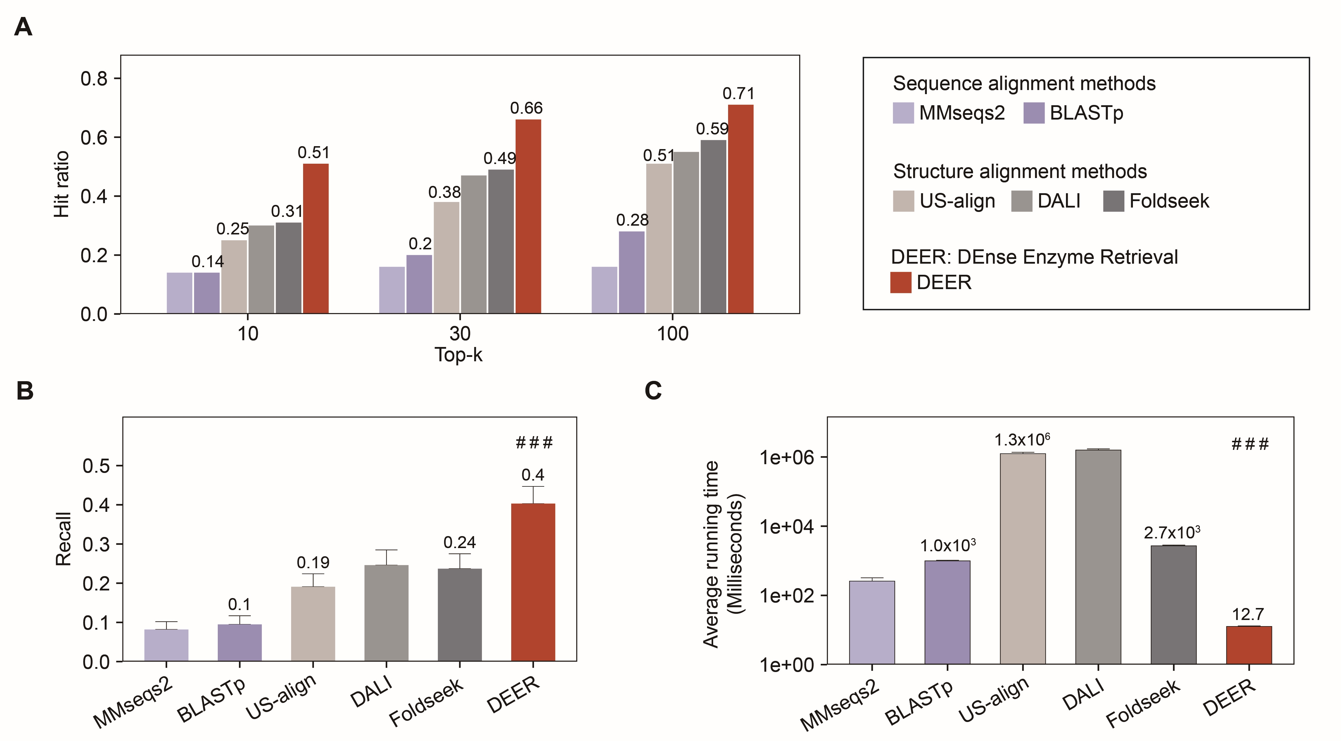 最后,研究团队开发了人工智能方法Dense Enzyme Retrieval(DEER),能够快速、高效识别同工酶,其性能显著优于现有的基于序列或结构比对的方法(图6)。DEER的模型训练运用了融合结构信息的蛋白质语言模型及对比学习技术,实现了对酶功能的准确预测;DEER模型的推理运用了密集检索技术,实现不依赖比对的快速检索;DEER模型的框架不仅适用于远源酶的挖掘,未来还可进一步拓展到其他功能的蛋白研究。