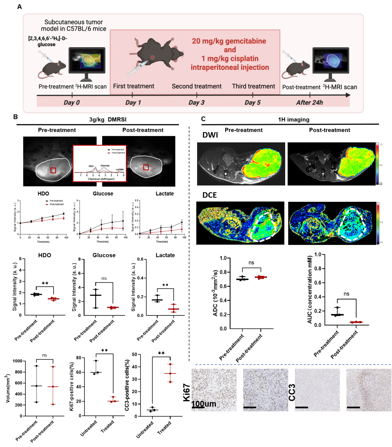 在膀胱癌的小鼠模型中,研究团队发现,DMRSI能够在化疗后仅 24 小时就捕捉到肿瘤代谢的明显变化:乳酸相关信号下降了 55%–80%,说明了肿瘤在经过化疗后糖酵解代谢活动被显著抑制。相比之下,此时常规 MRI 检查(如弥散加权成像DWI与动态增强成像DCE)看不出明显差别。进一步的组织学分析显示,这些代谢变化与肿瘤增殖下降、细胞凋亡增加等关键指标高度一致。这表明,DMRSI能更早反映治疗效果,有望为肿瘤疗效评估提供更及时、更直观的影像依据。