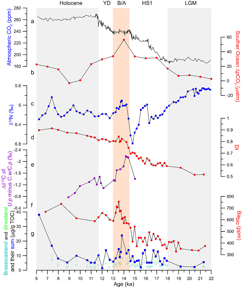 自2018年起,研究团队依托南海海洋研究所在南海南部采集的丰富沉积岩芯样品,重点围绕末次冰期以来热带太平洋海域的中深层环流体系的演变机制开展系列研究(Li et al.,2018;Zhang et al.,2025),旨在揭示太平洋中深层环流演化对热带低纬寡营养盐区海洋生产力的调控机制。本次研究聚焦于末次冰消期B?lling-Aller?d(B/A)暖期大气CO?浓度上升停滞这一科学谜题(Zhu et al.,2025):在该时期,南大洋通风作用增强且生物泵效应减弱,导致大气CO?含量显著上升,然而南极冰芯记录却显示其浓度在此期间保持稳定(图1)。目前,无论是来自海洋表层CO?分压的记录重建,还是基于陆地碳汇的数值模拟,均未能查明平衡B/A暖期南大洋显著碳源的关键机制。