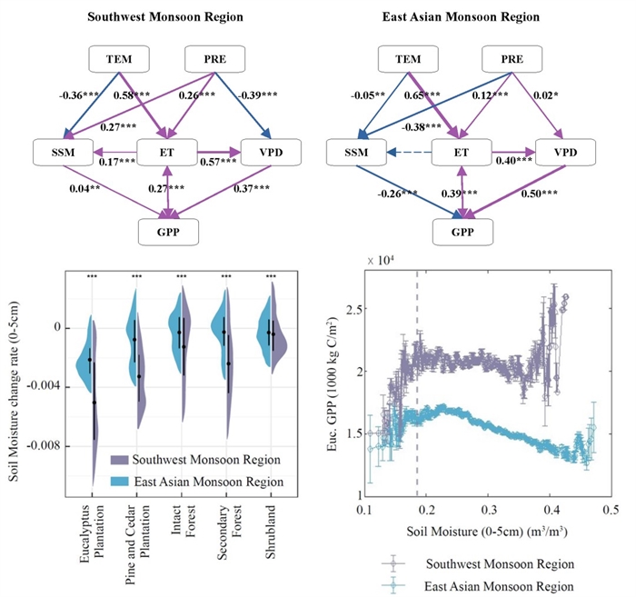 针对上述问题,中国科学院亚热带农业生态研究所环江喀斯特生态系统观测研究站王克林研究员团队,基于表层土壤水分、蒸散发、饱和水汽压差等多源遥感水分数据,系统分析了西南季风区和东亚季风区不同森林类型的碳-水关系区域分异。研究结果证实,桉树和马尾松等人工林相比天然次生林虽具有更高的生产力,但大规模集中造林确实会导致区域表层土壤水分的下降(图1)。尤其在季节性干旱明显的西南季风区,桉树林的表层土壤水分消耗速率达到东亚季风区的2.42倍,特别当表层土壤水分低于0.18m3/m3时,植被生产力开始受到抑制,表明水分供给已成为制约该地区植被恢复可持续性的关键因素。研究还发现,饱和水汽压差在两个气候区均表现出对总初级生产力的显著抑制作用,表明大气干旱也是影响西南地区植被生产力的关键限制性气候因子。