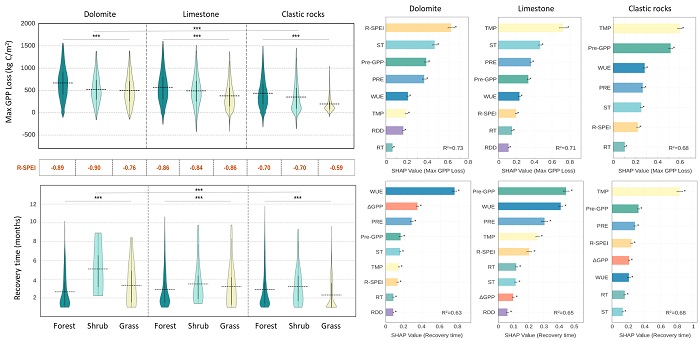 团队进一步发现上述水分限制矛盾在2022年西南地区破纪录的极端干旱事件中得到进一步印证。与森林和草地相较,西南地区灌丛在干旱后恢复最为缓慢,其整体恢复时间分别是森林和草地的1.39倍和1.32倍??λ固厍绕涫前自蒲曳植记?,植被表现出更强的干旱脆弱性:干旱期间灌丛的总初级生产力损失为碎屑岩区的2.57倍,且恢复时间延长60%(图3)。进一步分析表明,温度是非喀斯特区植被恢复的主要驱动因子,而水分利用效率则是喀斯特区植被恢复的关键限制因素。具体而言,在经历极端干旱后的恢复阶段,表层土壤水分受限时,喀斯特地区植被具有更高的水分利用效率;水分充足时,非喀斯特地区植被的水分利用效率更高。