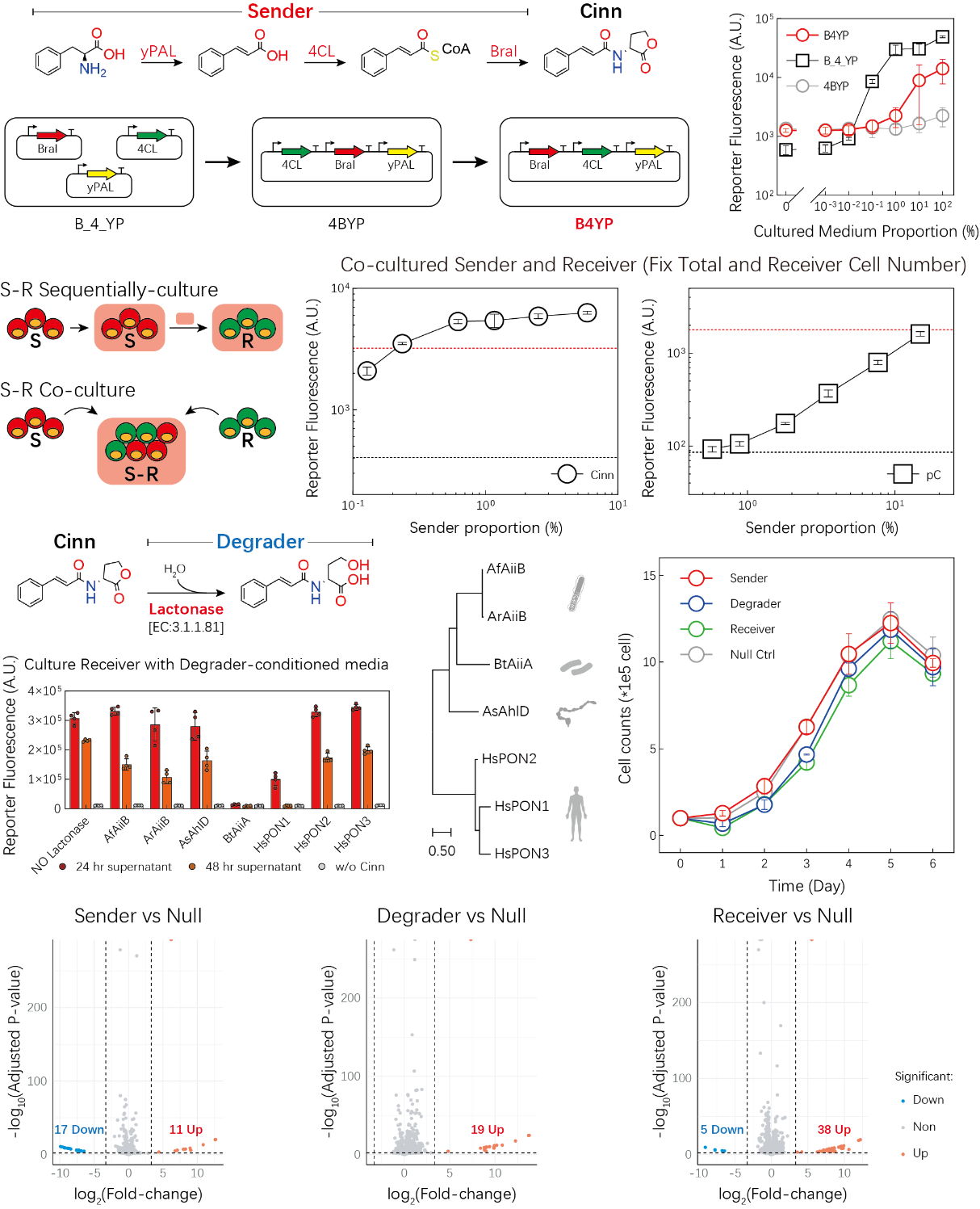 在发送??榉矫?,本研究设计了包含三种酶的代谢通路,以细胞内广泛存在的苯丙氨酸为底物,实现了无需外源前体(Precursor-free)的Cinn自主从头合成。通过对基因表达盒排布的优化,该??榭朔俗几扇牛迪至薈inn分子的稳定高效产出。共培养实验证实,得益于系统的高灵敏度,仅需极低比例的发送细胞即可有效激活接收细胞,建立了稳健的胞间通讯。为调控信号的时空动态,系统引入了高效的内酯酶降解???,防止信号累积导致的饱和与干扰。此外,基于细胞生长动力学与转录组学的评估表明,搭载各功能??榈墓こ袒赴胍吧臀尴灾钜欤な盗烁孟低尘哂凶吭降牡着碳嫒菪杂氲透旱L匦?。