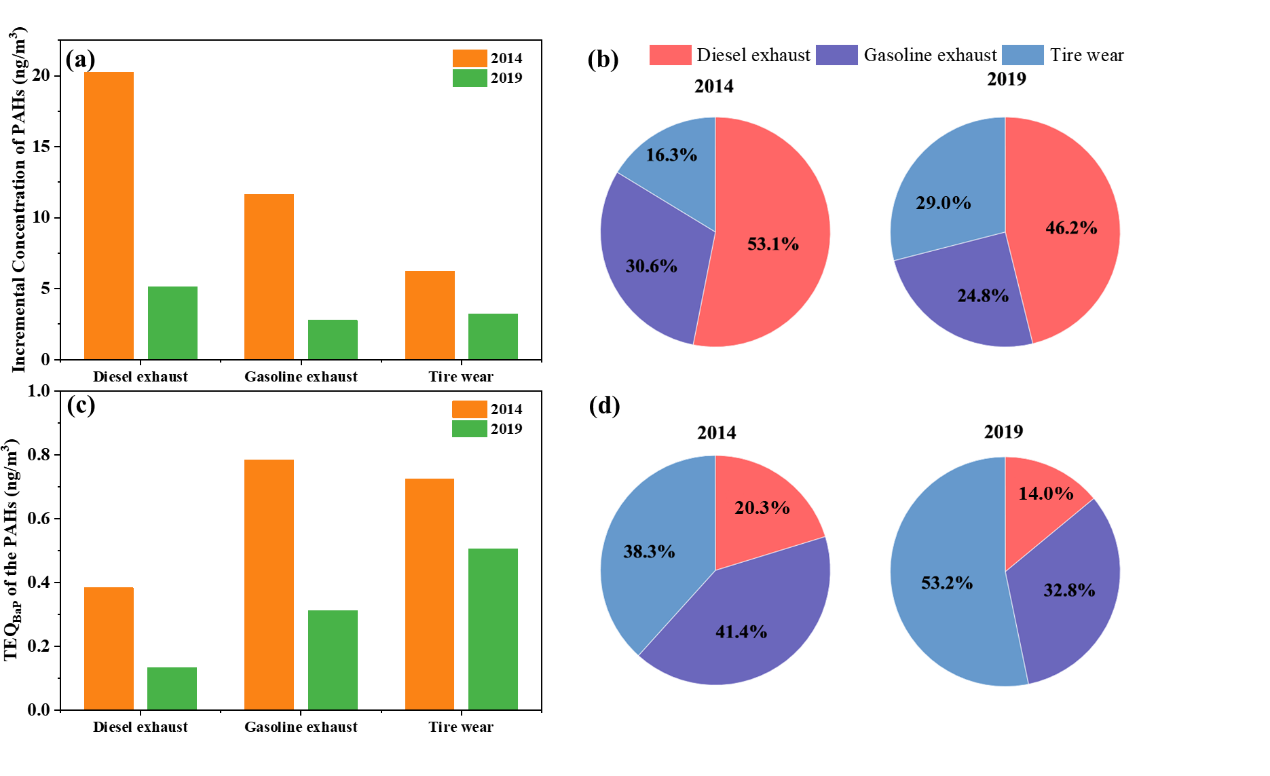 ?研究结果显示,2014-2019年期间,源于柴油车和汽油车尾气排放的PAHs占比从83.7%下降到71.0%,而轮胎磨损对PAHs的贡献则从16.3%上升到29.0%(图2);但如果以TEQBaP来评估潜在致癌风险计,源于尾气排放PAHs对TEQBaP贡献从61.7%下降到46.8%,而轮胎磨损排放PAHs对TEQBaP的贡献则从38.3%上升到53.2%,超过尾气源贡献。这一结果表明,随着尾气控制加严,轮胎磨损等非尾气来源不仅对颗粒物质量浓度有重要贡献,对颗粒物中毒害性组分及其健康危害也可能日益突出。电动汽车因车身更重、扭矩更大可能导致相对较多的轮胎磨损排放,在新能源车不断普及的背景下,更要考虑将非尾气排放纳入监管与健康风险评估,同时通过轮胎制作技术改进减少排放。
