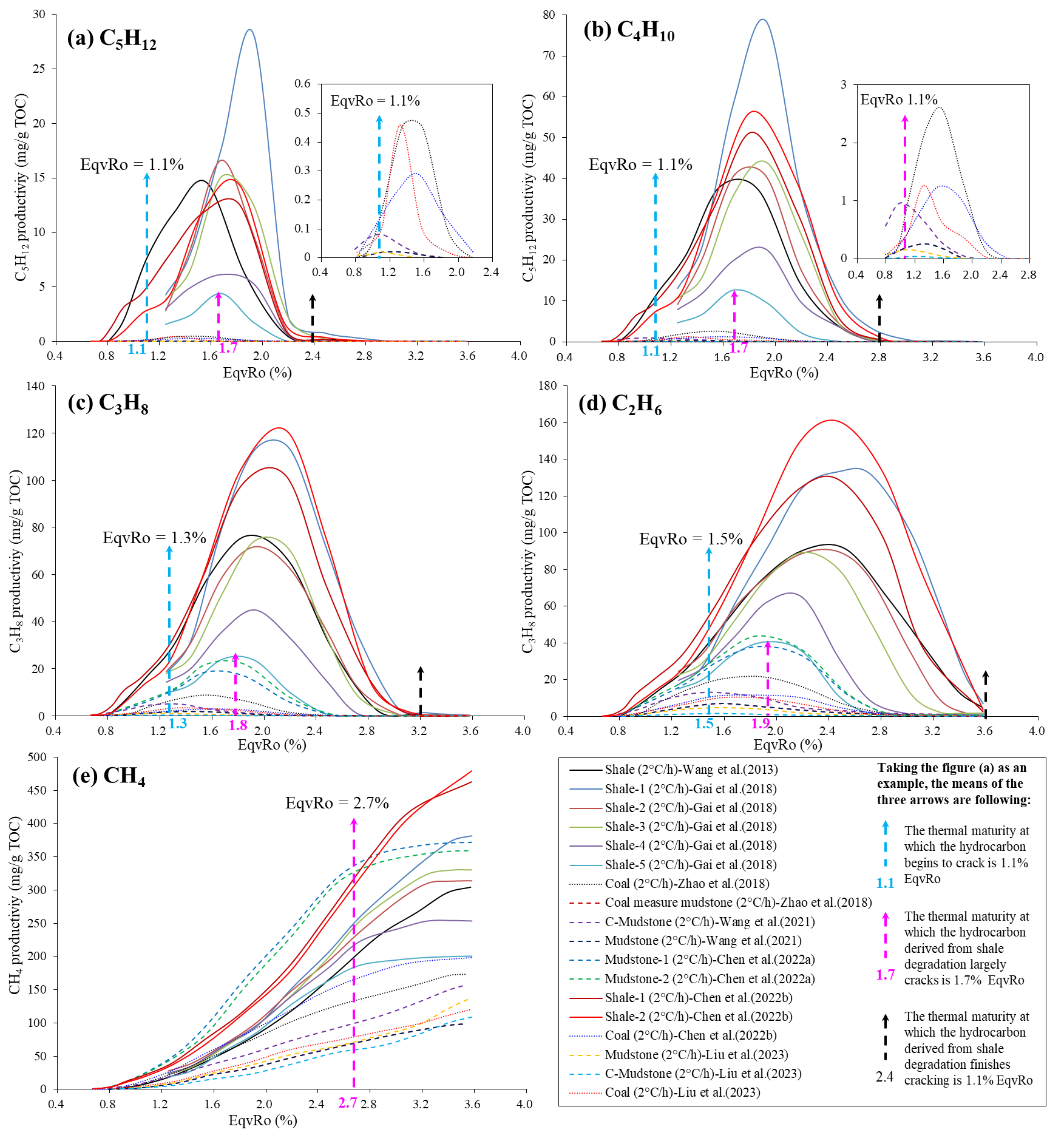 ?(1)页岩气藏中C5H12、C4H10、C3H8、C2H6和CH4的初始裂解的成熟度(Ro值)分别约为1.1%、1.1%、1.3%、1.5%和2.0%,主裂解阶段分别对应的成熟度(Ro值)区间约为1.7–2.4%、1.7–2.8%、1.8–3.2%、1.8–3.6%和3.0–4.0% (图1);