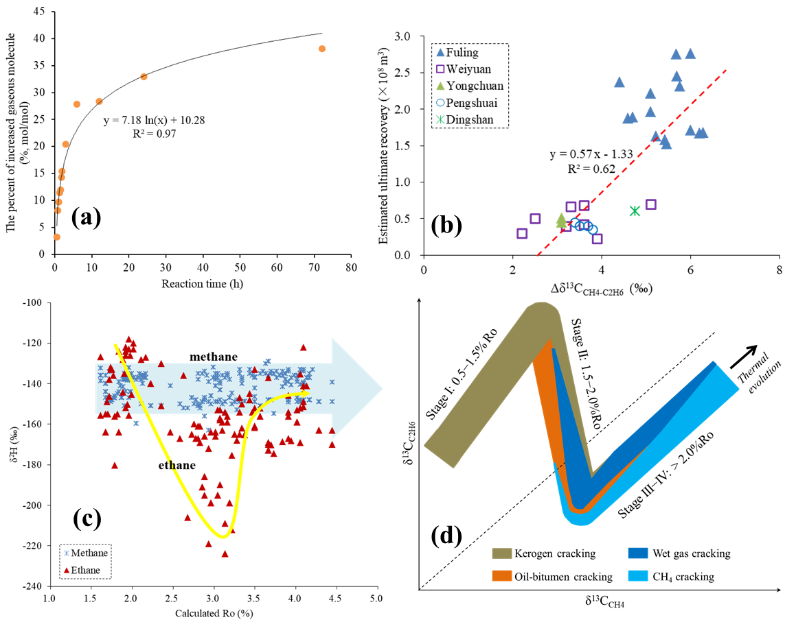 图2 (a)乙烷裂解过程中增加的气体摩尔数量百分比;(b)页岩气产气量与碳同位素倒转(Δδ13CCH4-C2H6)程度的关系;(c)四川盆地页岩气甲烷、乙烷氢同位素的演化特征;(d)页岩气碳同位素倒转成因演化模式图
