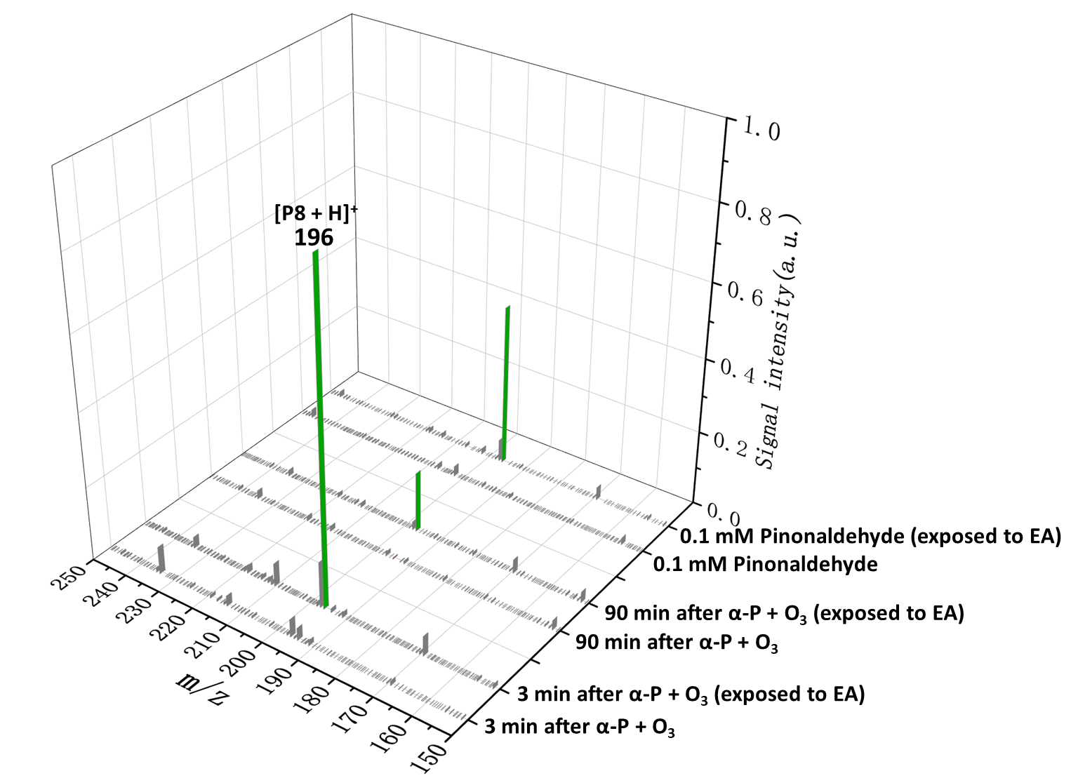 图2 (A)石竹烯和(B) α-蒎烯生成的α-HH暴露于相同浓度,不同种类有机胺以及氨气的信号强度,(C)和(D)中展示了对应生成物