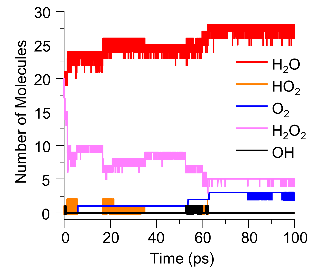 图 3. 黄铁矿{100}-V5表面被H2O2氧化100 ps期间的分子数变化