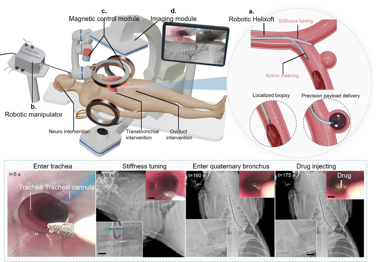 为应对磁驱变刚导管在尺寸、安全性和远场操控方面的限制,Helixoft系统通过将刚性磁性螺旋结构与柔性微管相结合,实现了磁响应能力与机械顺应性的协同设计?;凇安牧洗呕骷峁埂懦∧J健比灰惶宓纳杓瓶蚣?,研究团队构建了一种将磁驱螺旋运动与磁致弯曲相结合的解耦控制策略,在单一外部磁场作用下即可实现微导管刚度调节与主动转向的独立远程控制。该系统专为狭窄敏感的小腔道环境而设计,可集成至直径小至300微米的商用微导管中,实现跨越40倍范围的连续刚度调节。通过建立描述其力学行为的理论模型,实现对Helixoft微导管运动姿态的精确预测。此外,Helixoft微导管具备良好的功能扩展性,不仅支持多节段分布式、相互独立的刚度调节,还可集成微型摄像探头、电极或激光光纤等???,为实时成像、组织消融和多模态微创介入操作提供支持。在多例活体动物支气管模型中,研究团队在Helixoft系统中集成了微型成像器件,并结合临床影像设备与自主搭建的导管推进机构,开展了基于双模态影像引导的磁控导航与靶向药物转运实验。通过血液炎症反应检测和组织学分析等系统性评估,验证了该系统在体内应用中的可行性与安全性。同时,还完成了输卵管离体器官模型中精准取样演示。