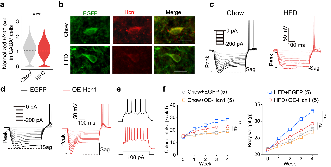 图2. Hcn1通过调节LSGABA神经元兴奋性干预高脂饮食引发的肥胖进程