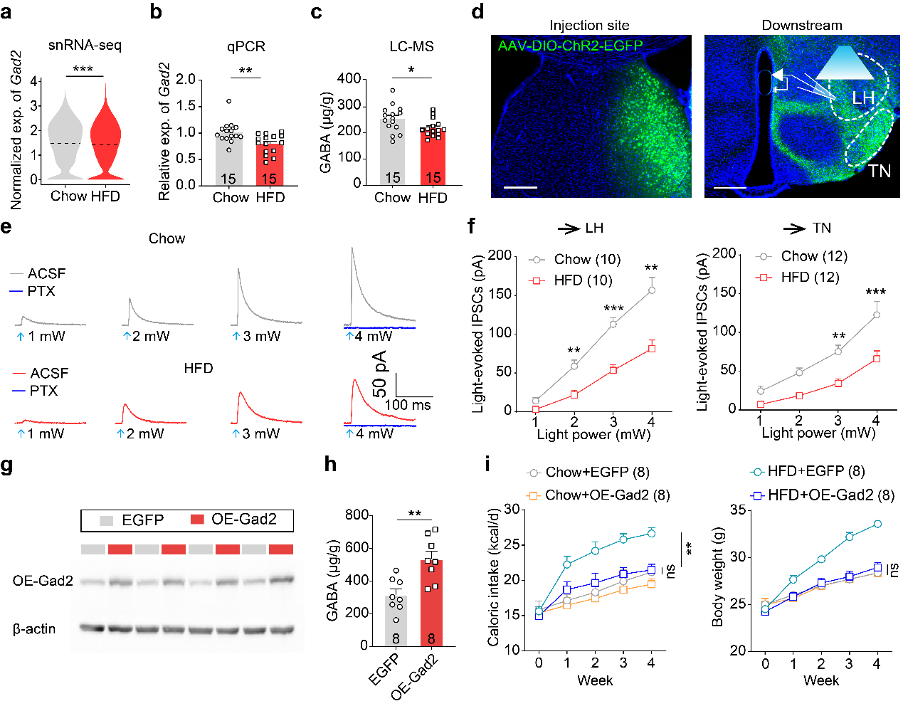 图3. Gad2通过调节LSGABA神经元对下游的抑制能力干预高脂饮食引发的肥胖进程