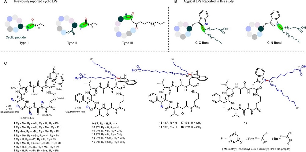 图1?(A) 典型脂肽的连接方式;(B)本研究报告的非典型脂肽;(C) 化合物1-19的结构图
