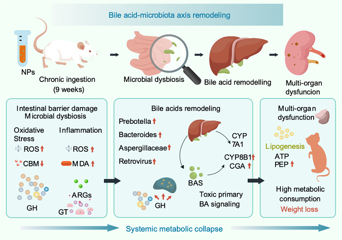 在前期基础上,本研究聚焦于环境纳米塑料(NPs)污染对人体健康的潜在危害,通过构建小鼠慢性暴露模型,系统探究了粒径更?。ā? μm)、穿透力更强的纳米塑料如何穿透生理屏障并诱发全身性代谢紊乱。研究重点考察了“肠道-肝脏-肾脏”这一机体核心代谢轴对纳米塑料暴露的响应规律,量化分析了肠道微生物组成、胆汁酸(BA)代谢图谱以及远端器官功能指标的系统性变化。
