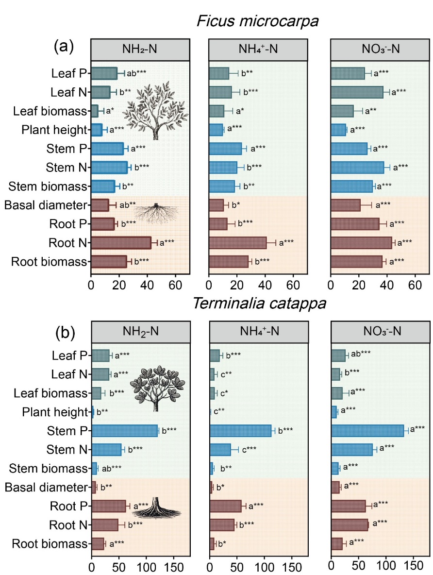 热带珊瑚岛土壤呈强碱性、保肥力弱且氮素严重匮乏。传统植被恢复常依赖增加施肥量,极易导致氮素流失及环境风险。为此,中国科学院华南植物园小良站团队利用15N同位素示踪技术,以珊瑚砂为基质,选取细叶榕(Ficus microcarpa)和大叶榄仁(Terminalia catappa)两种热带珊瑚岛适生物种,系统评估了铵态氮、硝态氮和酰胺态氮三种形态对植物生长及土壤养分固持的影响。