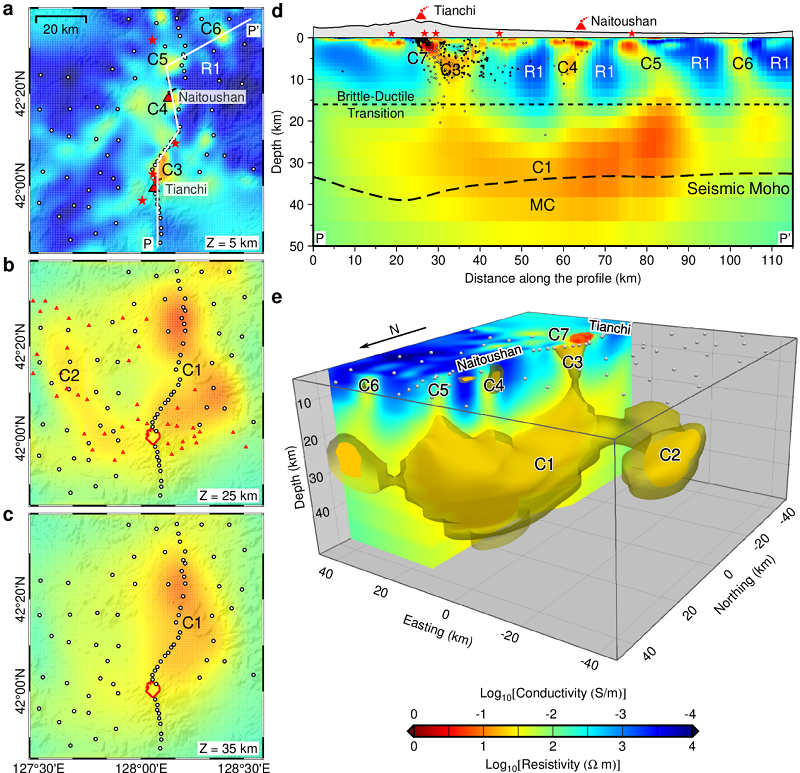 研究团队基于长白山火山区的78个大地电磁台站数据,构建了高分辨率的三维电阻率模型,在天池火山下方识别出从浅地表至上地幔垂向连续分布的低阻异常,反映了完整的跨地壳岩浆系统。该系统包含三个明显分层又相互连通的岩浆储库:(1)下地壳玄武质岩浆储库(20-35km深),估算熔融分数2.1-3.7%,体积约19,500 km3,构成深部地壳热区主体;(2)上地壳粗面质岩浆储库(5-10km深),估算熔融分数7.0-16.3%,体积约95 km3,顶部地震频发,可能与岩浆驱动破裂有关;(3)浅部碱流质岩浆储库(2-3.5 km深),估算熔融分数18.8-23.8%,体积约36 km3,与长白山“千年大喷发”岩浆房位置吻合。