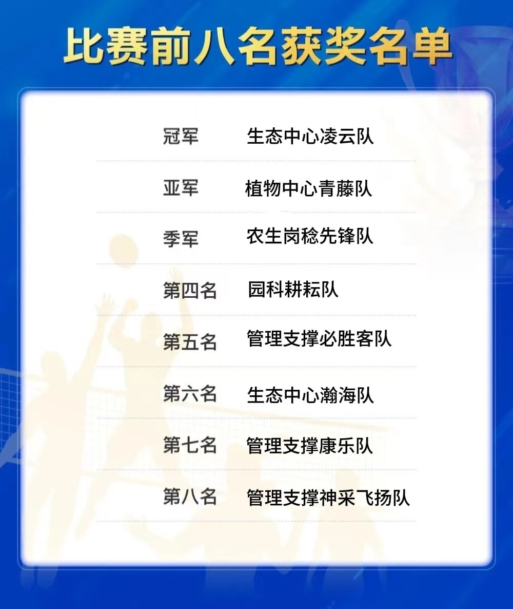 此次比赛采用小组循环赛与淘汰赛相结合的赛制,赛况激烈,精彩纷呈。赛场上,队员们斗志昂扬、团结拼搏、配合默契,发球精准有力,扣杀凌厉果断,防守稳健有序,每一次精彩得分都赢得现场观众的阵阵掌声和欢呼声。经过一整天的激烈角逐,最终生态中心凌云队凭借出色的团队协作和稳定发挥成功卫冕,植物中心青藤队与农生中心岗稔先锋队分获亚军和季军。